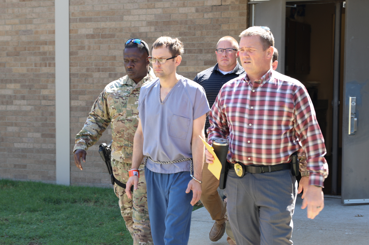 Suspect is walked in handcuffs to a transport to be taken to Craighead County Jail.