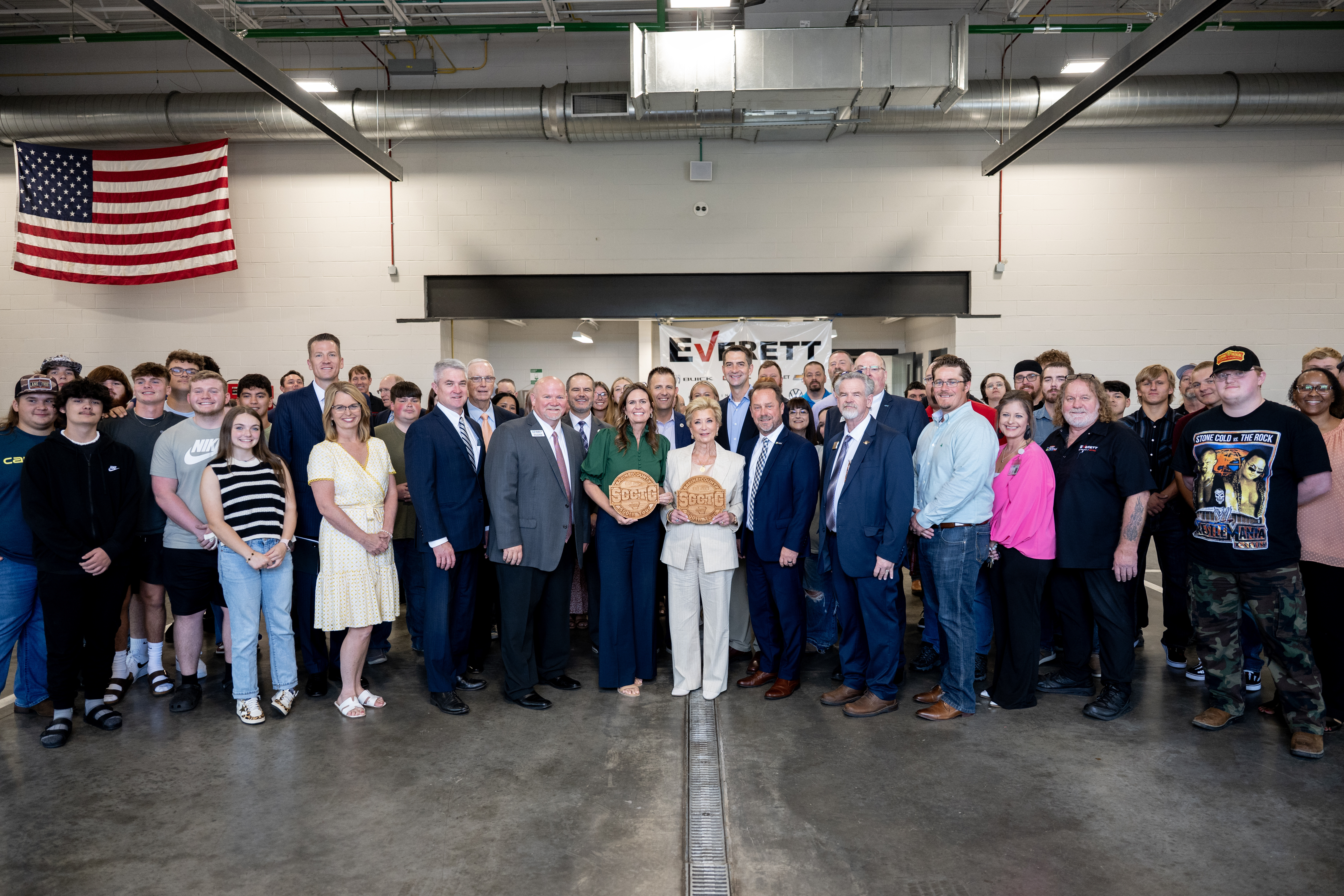 Governor Sarah Huckabee Sanders, U.S. Department of Education Secretary Linda McMahon, U.S. Senator Tom Cotton, Arkansas Division of Higher Education Commissioner Ken Warden, Saline County Career & Technical Campus Vice Chancellor, Scott Kuttenkuler, and local elected officials, with Automotive Service Technology students in Benton on Tuesday, August 12th. Photo credit: Will Newton.